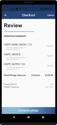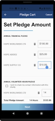 New features to the 2021 Campaign: The mobile app now allows donors to have the same giving options as the online pledge experience. Donors can search and donate to charities to make recurring or one-time pledges using payroll, bank account, or credit card information. Employee pledges of volunteer hours can also be made to charities that have volunteer opportunities (identified with hand icons). The app supports Touch ID and Face ID for easy and secure access to giving accounts.